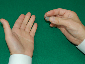 コインの表面(フラットサイド)に付けて、コインを手の平の中に押し付けます。
