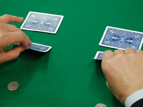 同時に左手は持っているカードを、そのフェイス側に隠している2枚のコインと共に